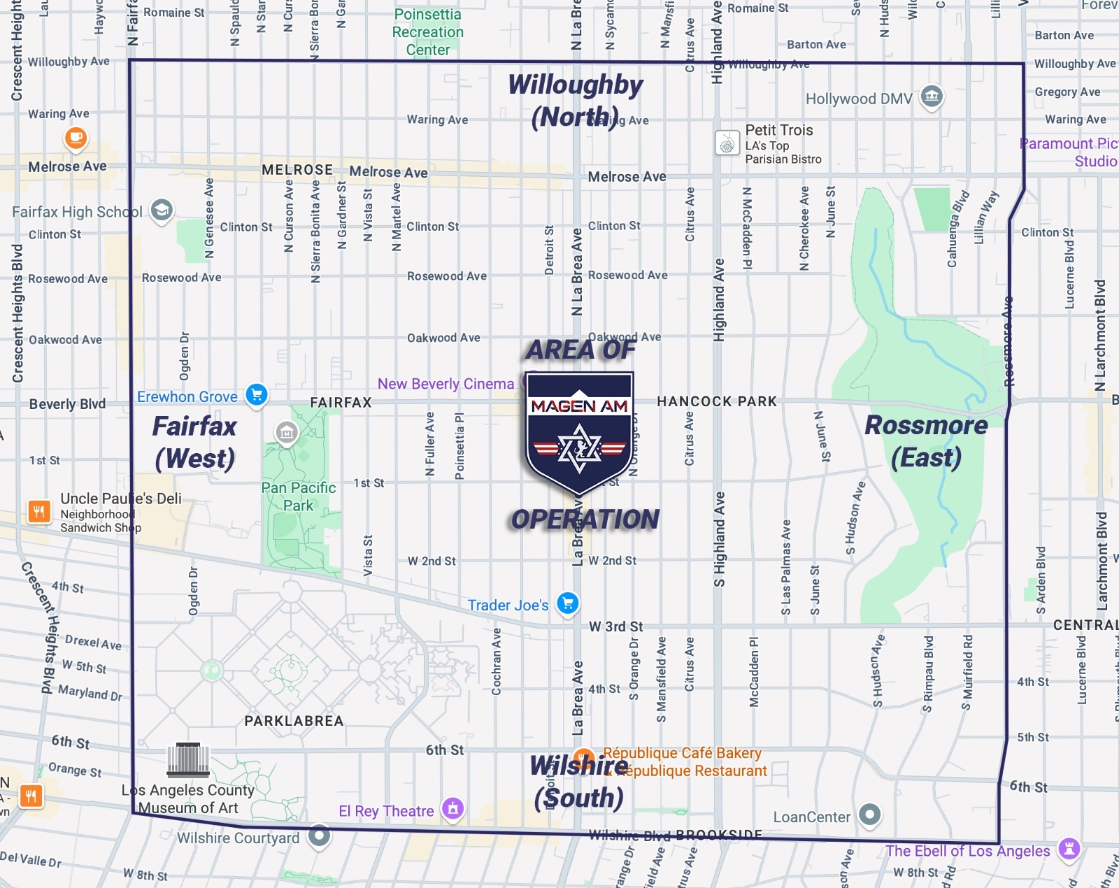 Patrol area boundaries: North of Wilshire, South of Willoughby, East of Fairfax, West of Hudson/Rossmore.